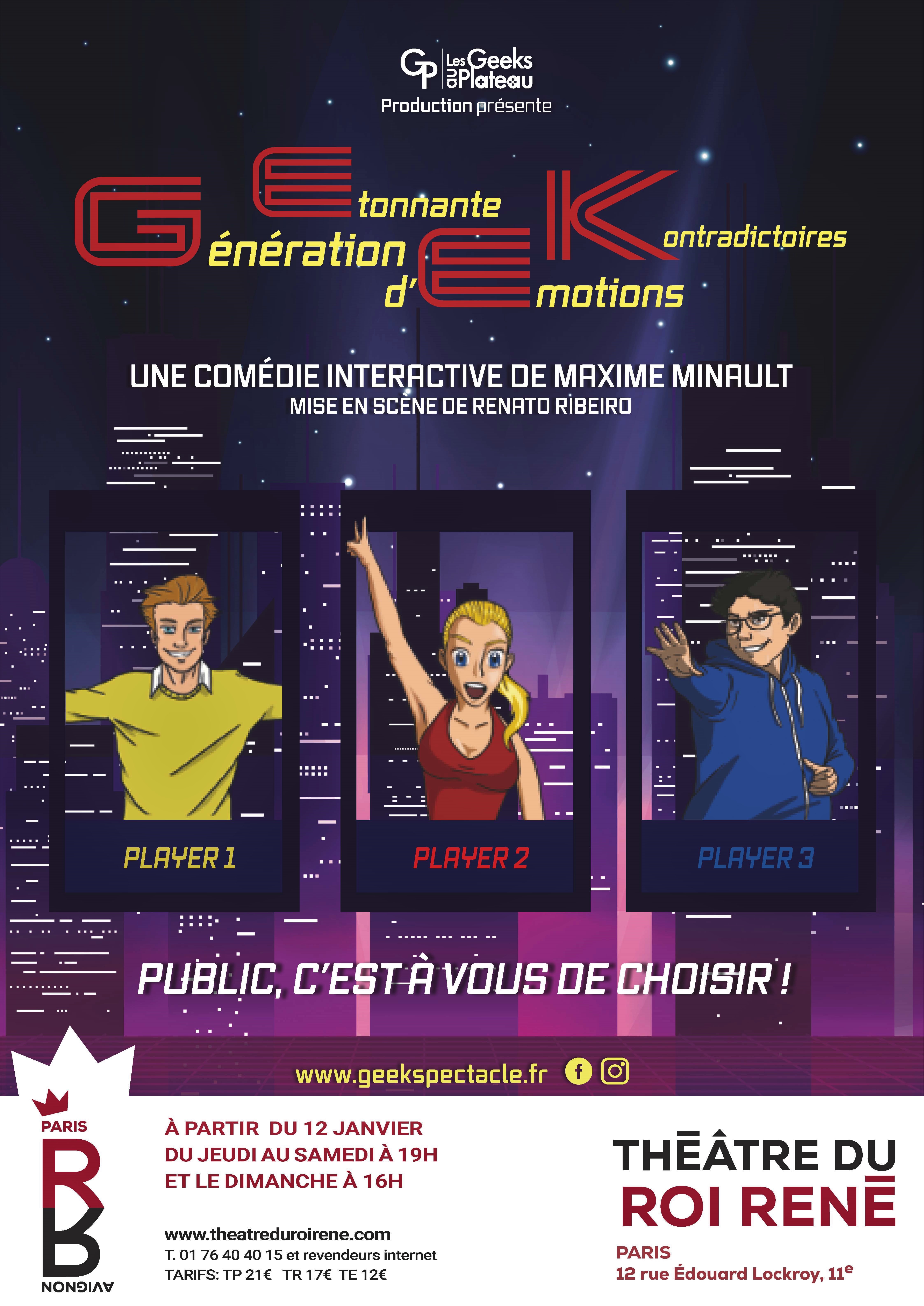 Plus de 19 000 combinaisons de scénarios sont possibles dans ce spectacle original produit par Les Geeks au Plateau Production, que l’on peut voir à partir du 12 janvier 2023 au Théâtre du Roi René à Paris.
