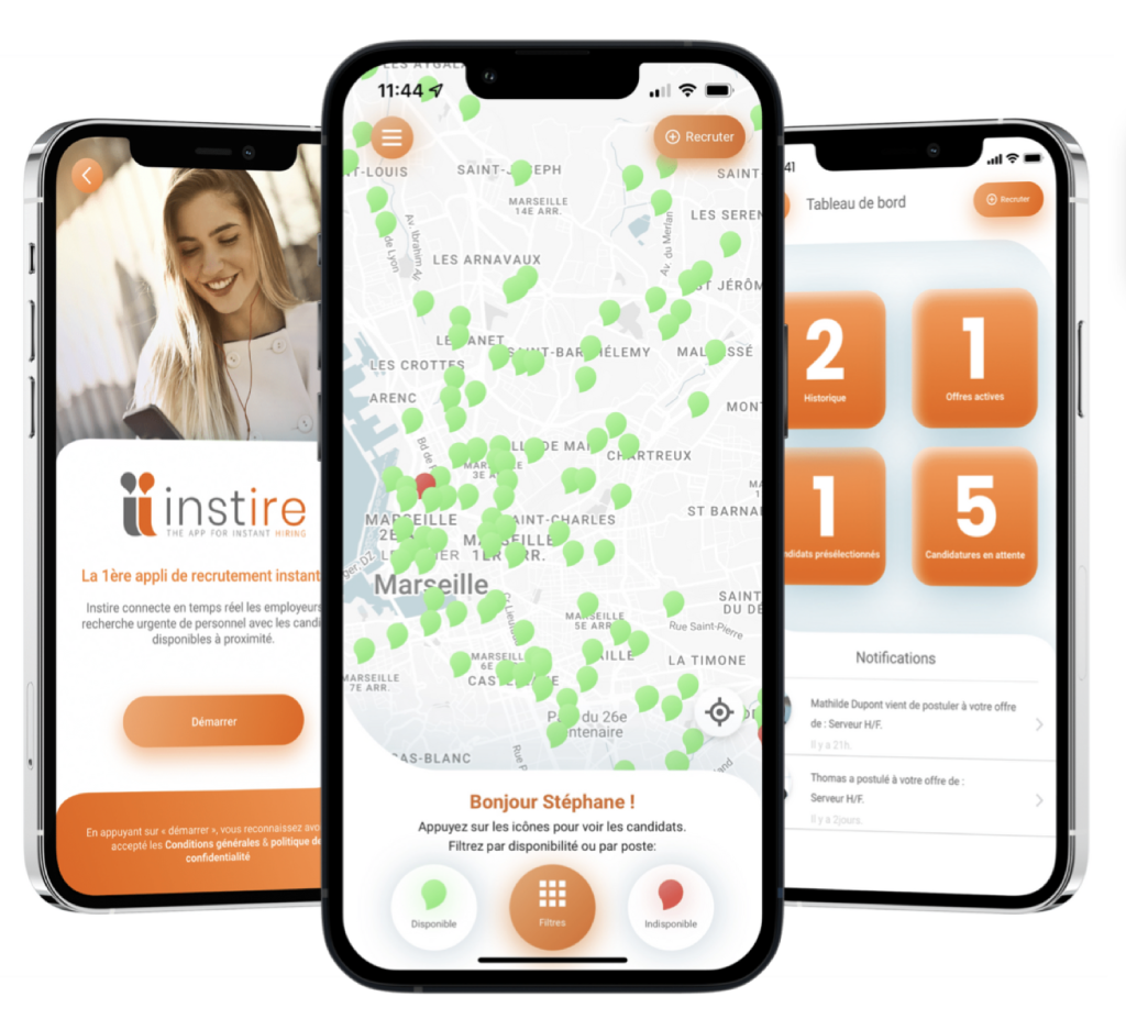 INSTIRE est la première application de recrutement instantané qui permet aux employeurs en recherche urgente de personnel d’être mis en relation en temps réel avec les candidats disponibles à proximité.