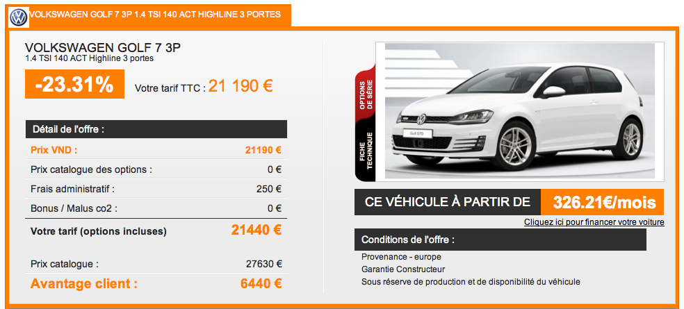 - Volkswagen Golf 7 – 1.4 TSI 140 ACT Highline 3 portes : 21 190 € au lieu de 27630€ au prix catalogue, soit une remise de 6440€