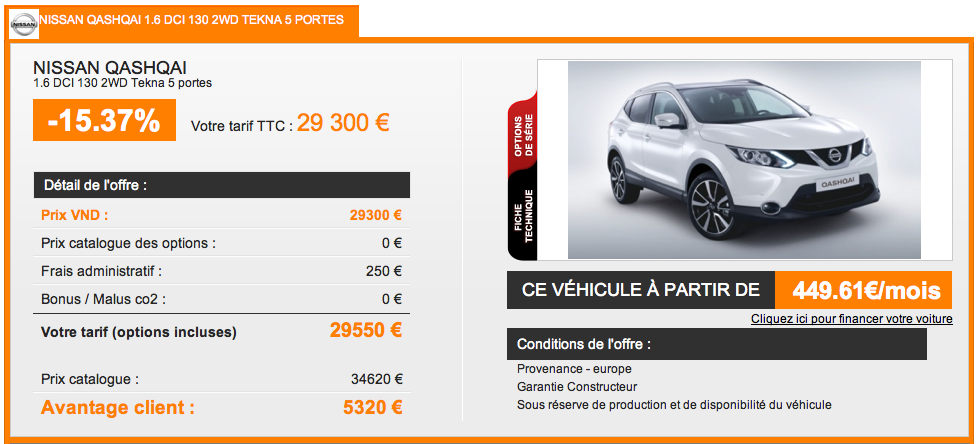 - Nissan Qashqai – 1.6 DCI 130 2WD Tekna 5 portes : 29300 € au lieu de 34 620 €, soit une remise de 5320 €
