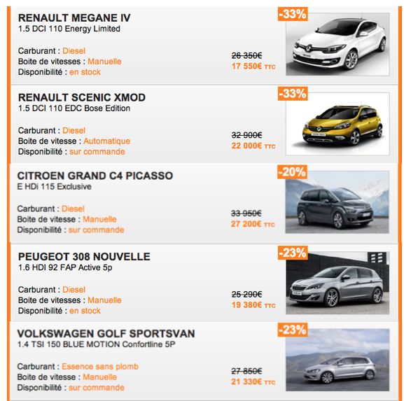 Quelques clics suffisent pour configurer la voiture neuve de ses rêves et recevoir instantanément par mail un devis gratuit précisant le tarif initial et la remise appliquée.