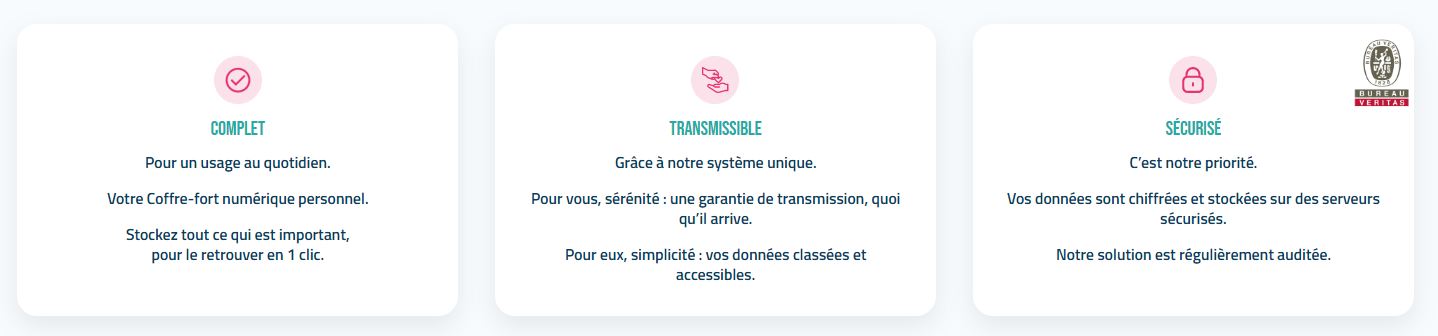 - Il est complet : le coffre est organisé en catégories administratives personnalisables et transmis grâce à des clés sécurisées.