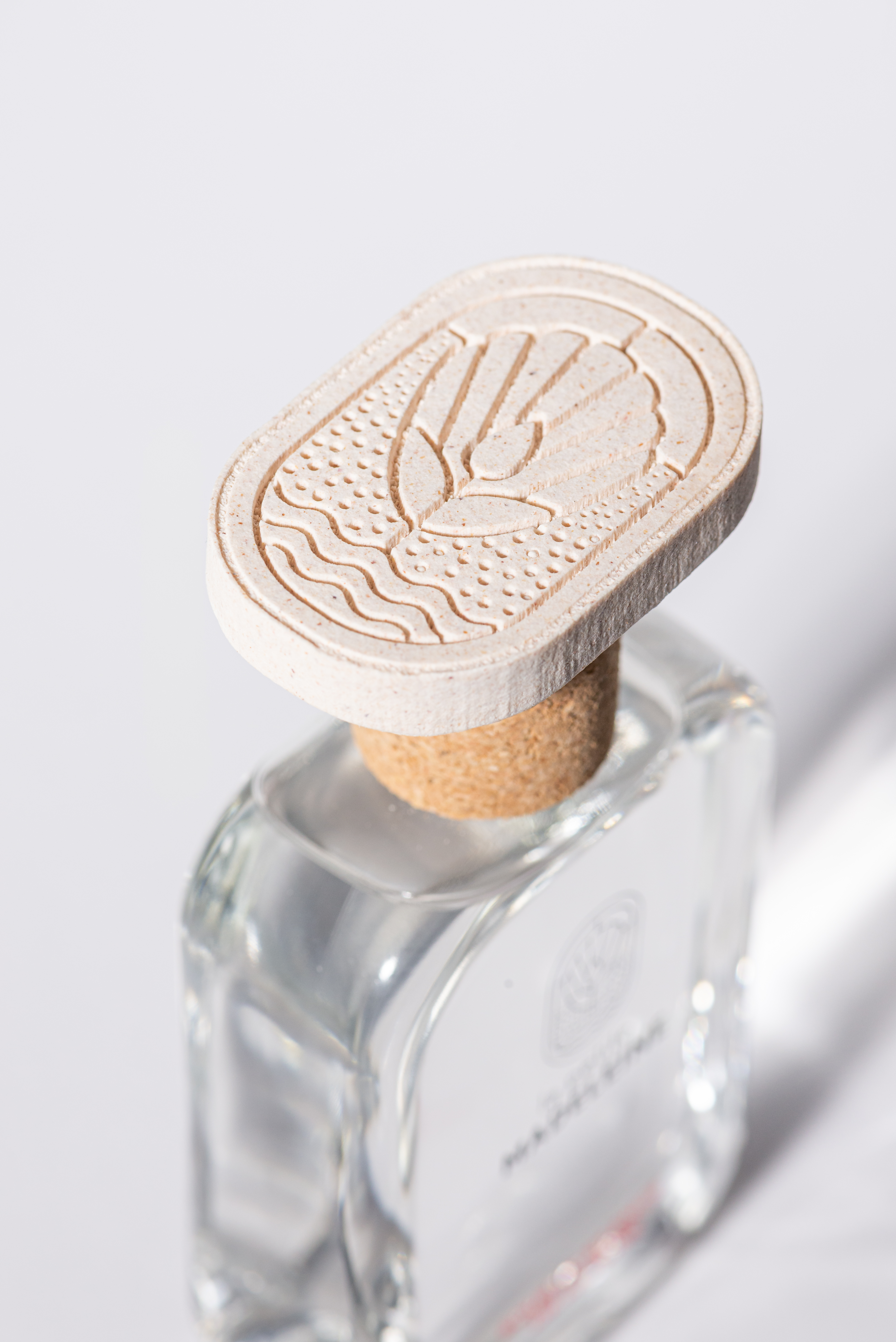 Les bouchons apportent une touche supplémentaire de rêverie. Ils sont faits avec du liège et surmontés de galets réalisés à la main par un duo de designers à partir de poudre de coquillage. Chaque eau de parfum est unique.