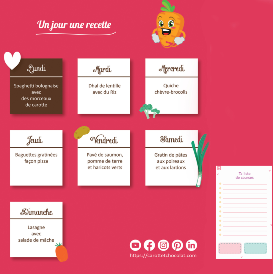 - Des idées de menus pour quatre semaines, qui permettent d’éviter le casse-tête de l’organisation des menus de la semaine ;