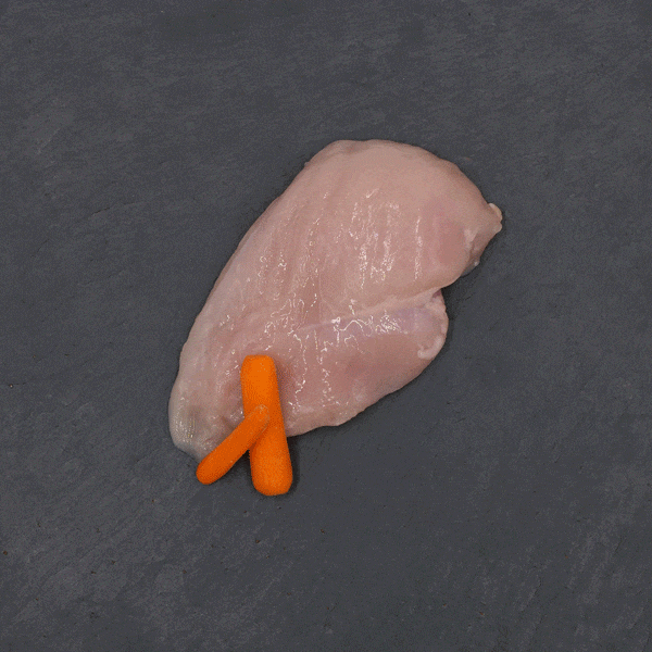 Filet de poulet – Gros grains Morceaux de taille plus importante à « mâcher », ce qui s’approche d’un repas chassé par le chat et favorisant de plus l’entretien bucco-dentaire de ce dernier.