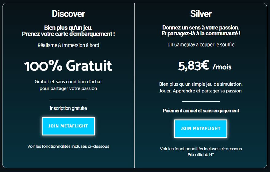 - La formule « Platinum » (à venir). Cet abonnement permet d’accéder au rôle Airline Manager pour prendre le contrôle de sa propre compagnie aérienne virtuelle et contribuer au gameplay de MetaFlight.