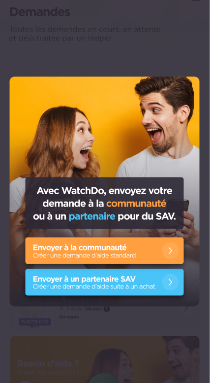 WatchDo est une application communautaire qui associe un principe ancestral et une technologie innovante. Elle est la seule application française à proposer de l’entraide par visioconférence : les particuliers peuvent résoudre leurs problèmes eux-mêmes, sans faire appel à un professionnel, et apprennent à faire les bons gestes en regardant les « Helpers » faire.
