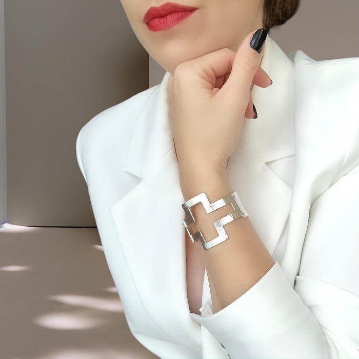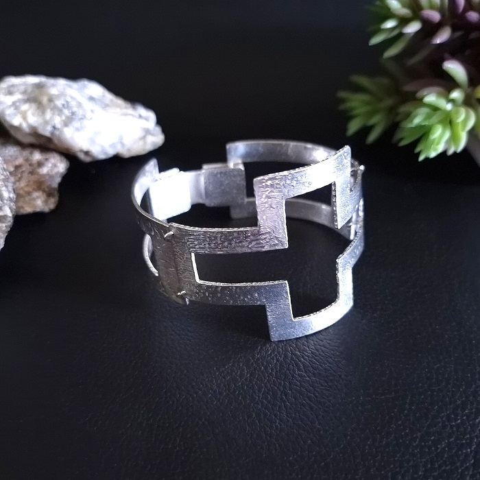 Coup de cœur assuré pour cette manchette en métal texturé, qui ose un design aux formes géométriques affirmées.