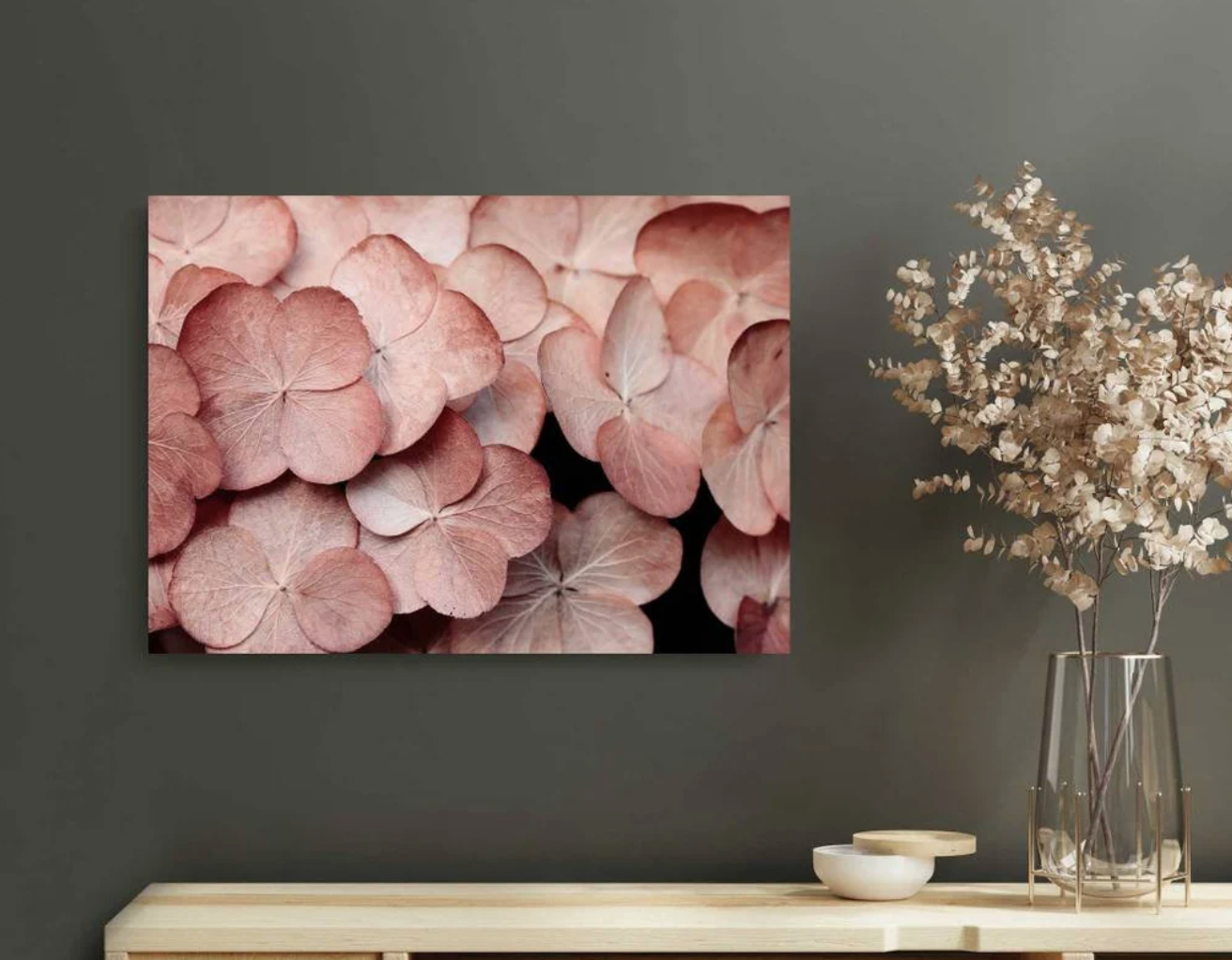 Ce tableau floral représente des fleurs d’hortensia séchées, dans un doux ton rose pâle. Il se marie avec bonheur aux autres photographies d’hortensia d’Élisa Guillon.
