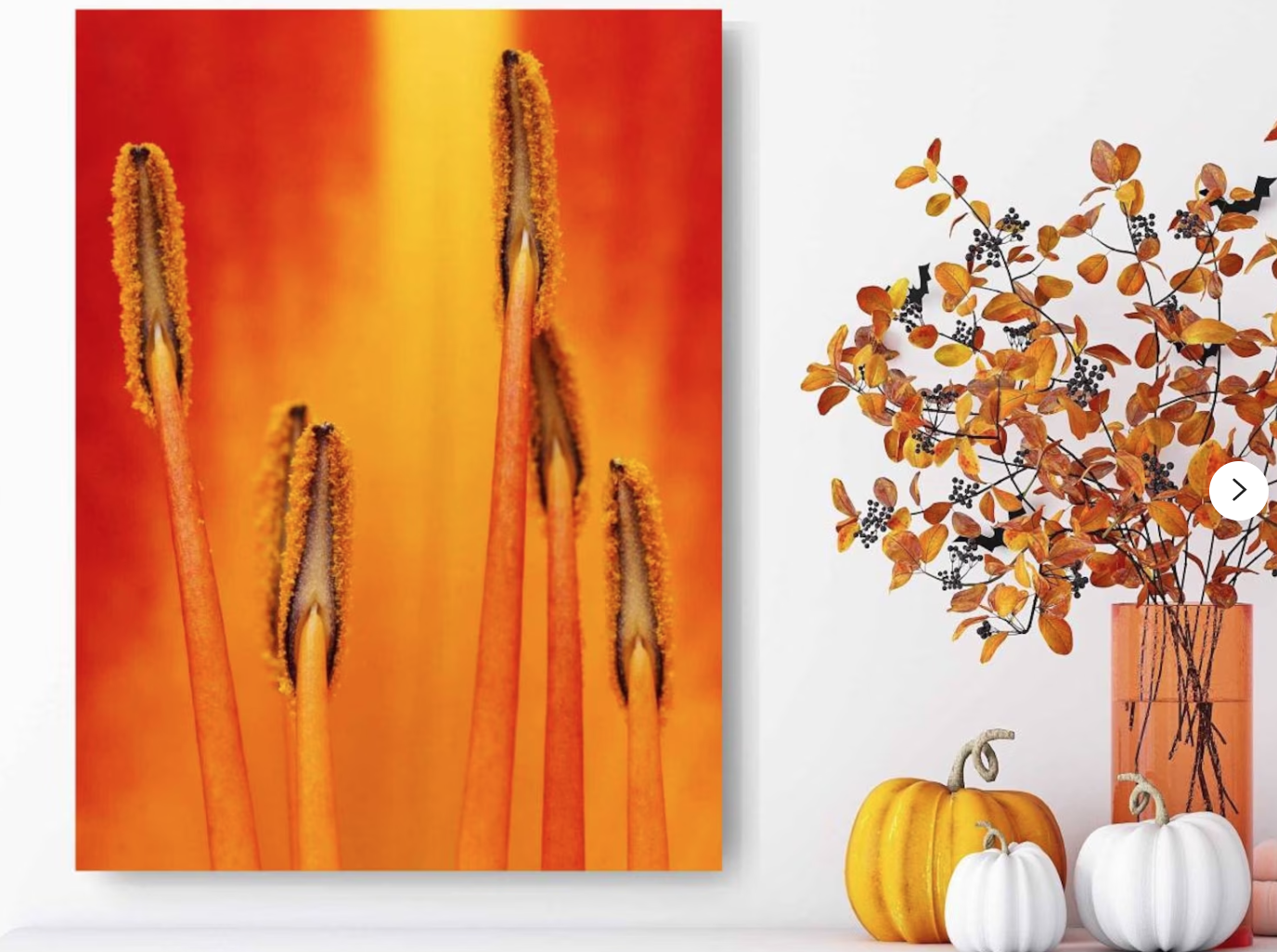 Le lys se révèle sous un angle original : la photographie ne montre pas ses pétales, mais se focalise sur ses étamines, dont on distingue tous les détails. Cette photographie donne couleur et chaleur à la décoration intérieure.