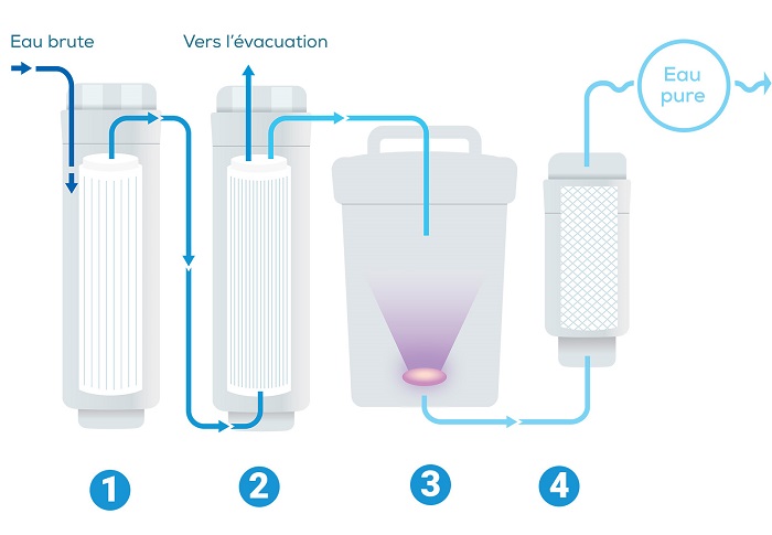 Enfin, le dernier post-filtre à charbon actif (C) rajoute faiblement des minéraux (calcium, magnésium et fer) afin d’équilibrer l’eau.
