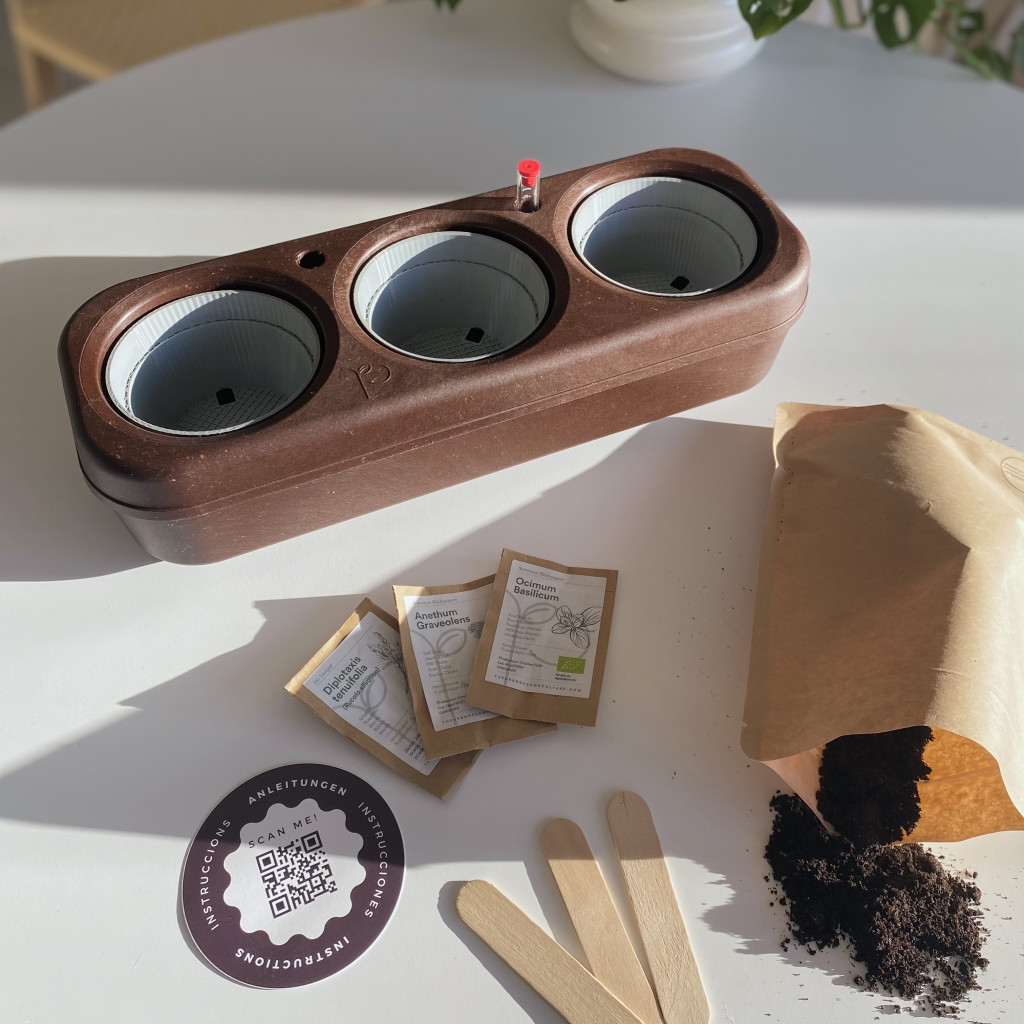 - 3 variétés de semences bio (basilic, persil, coriandre, laitue romaine verte ou rouge, aneth…) ;
