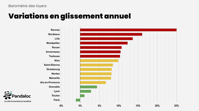 L’analyse des variations de loyers en glissement annuel du baromètre Pandaloc fait apparaître une grande disparité entre les villes où les loyers progressent moins vite que l’inflation, voire diminuent, comme Paris (-1,1 %), Toulon (+1,1 %), Lyon (+2,8 %) et Grenoble (+4,3 %), et des métropoles où les loyers flambent comme Rennes (+25,7%), Bordeaux (+16,1%) et Lille (+13,7 %).