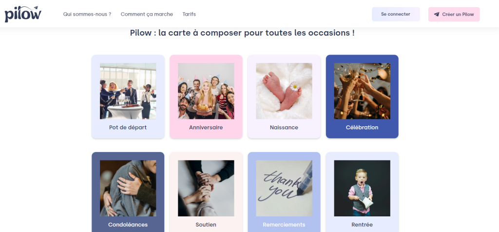 - Des cartes pour toutes les occasions. Pilow ne s’adresse pas à une niche. L’outil peut être utilisé par toutes celles et ceux qui ont envie de faire plaisir à plusieurs, dans le contexte familial, amical et professionnel.
