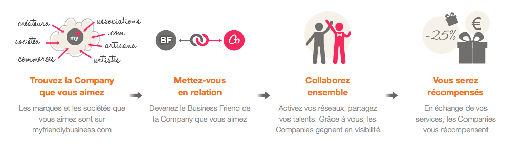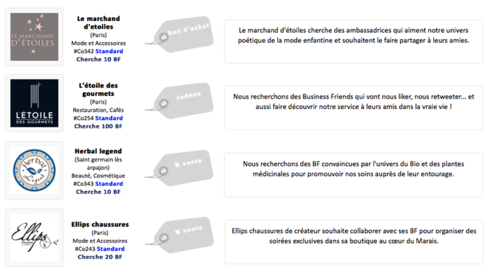 De l’autre côté, des particuliers motivés et influents, actifs sur les réseaux sociaux, qui animent un blog, ou tout simplement qui prennent part activement à la vie de leur quartier/ville, etc. : Les Business Friends, dénommés « BF ».