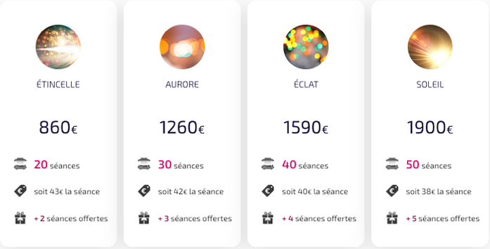 Ainsi, le forfait Découverte, au prix de 250 €, donne droit à 5 séances de 25 minutes.