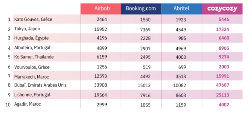 Méthodologie : les données sur les destinations tendances ont été recueillies à l’aide de Google Travel Insights (recherche d’hébergements dans le monde entier entre le 01/12/2022 et le 11/03/2023). Les données sur la disponibilité des hébergements ont été recueillies à partir des paramètres du site Web interne. *En raison de l’embargo, aucun logement n’a été trouvé.