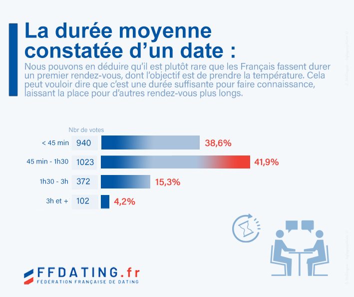 Les Français font rarement durer leur premier rendez-vous. Pour prendre la température, près de 42 % déclarent que leur date dure 45 min à 1h30.