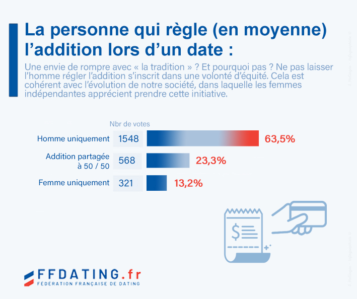 Mais les choses tendent à évoluer : 23,3 % des Français partagent l’addition à égalité, tandis que 13,2 % des femmes prennent l’initiative de payer seules la note.