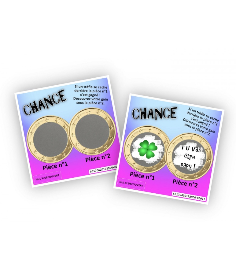 Conçues sur le modèle d’un ticket de jeu « Chance », ces cartes à gratter sont personnalisables avec un message au choix, pour faire une annonce originale de mariage, de grossesse ou de tout autre évènement. Elles se déclinent en plusieurs coloris, et peuvent être livrées avec une pochette cadeau.