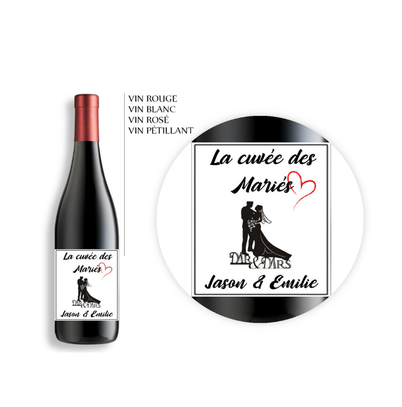 Avec son étiquette personnalisable, cette « cuvée des mariés » est un beau cadeau de mariage. Elle peut également apporter la touche finale à la décoration d’un mariage. Plusieurs vins sont proposés : rouge, blanc, rosé, pétillant blanc demi-sec et pétillant rosé demi-sec.