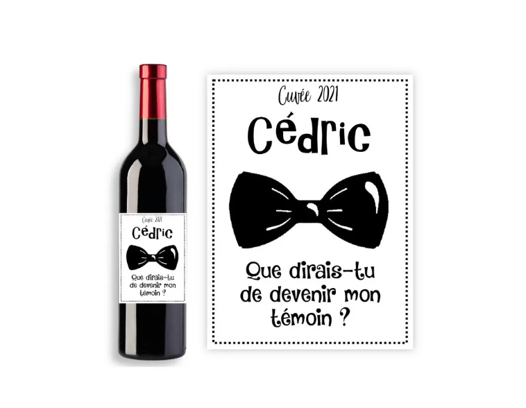 Une fois collée sur une bonne bouteille de vin, cette étiquette personnalisée permet de demander à un ou une amie de devenir témoin de son mariage… puis de boire un verre ensemble pour fêter la nouvelle.