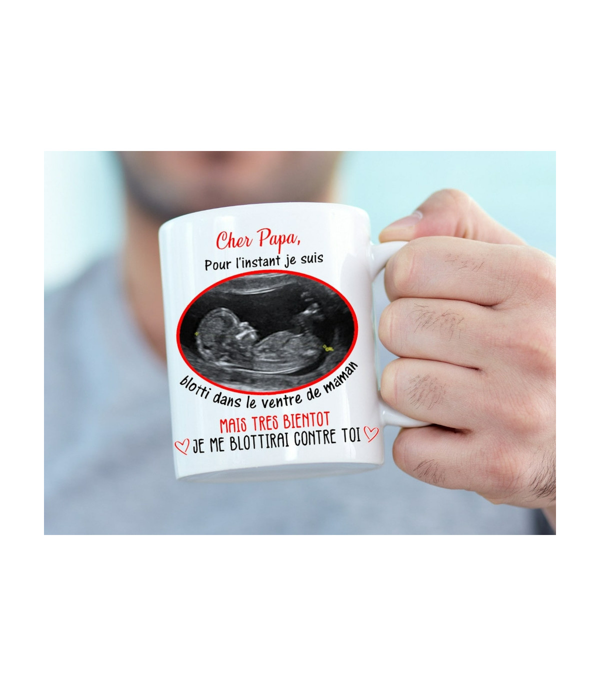 Ce mug est une façon amusante d’annoncer à l’homme de sa vie qu’il va devenir papa. Il est personnalisable avec l’échographie de bébé. Il est disponible en version mug magique : tout noir quand il est froid, le mug dévoile son message quand on y verse de l’eau chaude.