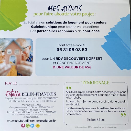 Envie d’Ailleurs Conseil et Immobilier est un guichet unique qui répond aux problématiques liées au logement des séniors. Son rayon d’intervention comprend les départements de l’Aube et de l’Yonne.