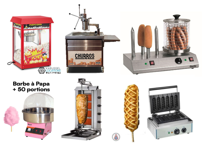 Il comporte des machines à glace italienne, des machines à granité, des stands de pop-corn et hot-dog, des crêpières, des machines à churros et bien d’autres comme des fontaines à chocolat.