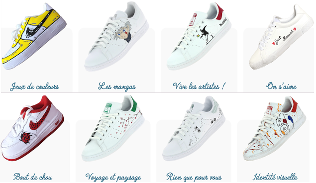 Revisitant, avec style et élégance, les incontournables de la basket – Nike Air Force ; Adidas Stan Smith – chacune des collections se décline en plusieurs modèles de personnalisation.