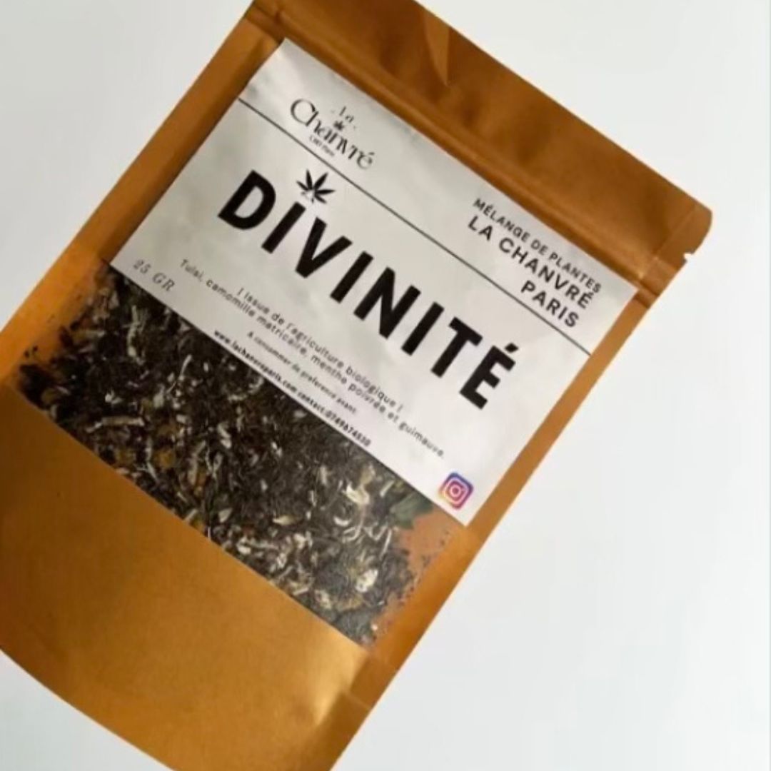 - Le mélange Divinité. Ce mélange invite à la relaxation et à la détente. Il contient du basilic sacré Tulsi, qui est une des plantes centrales de la médecine ayurvédique et qui a des propriétés anxiolytiques et antidépressives, ainsi que de la camomille matricaire, de la menthe poivrée et de la guimauve.