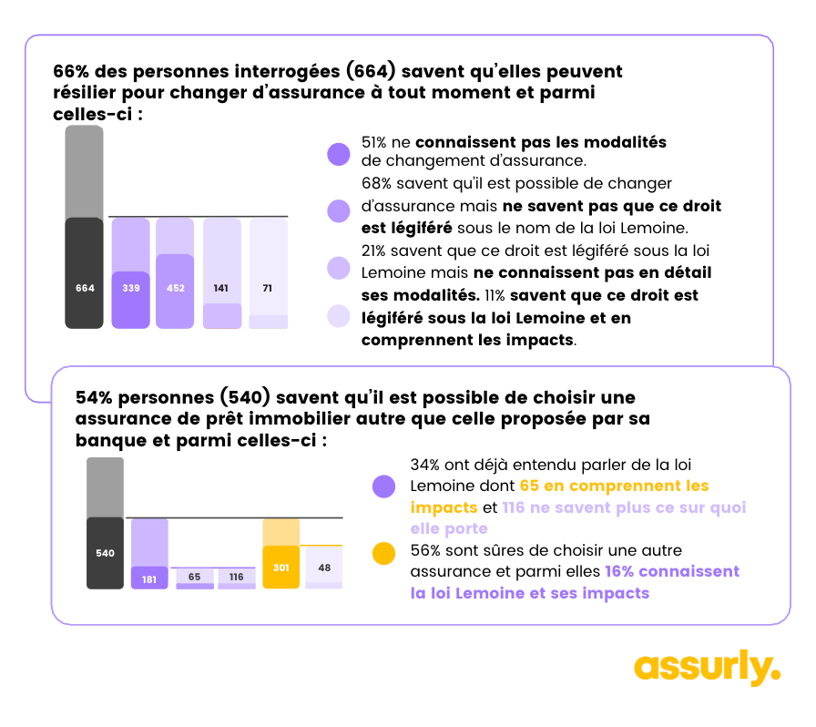 Les résultats de l’enquête montrent que 66 % des personnes interrogées savent qu’elles peuvent résilier leur assurance à tout moment pour en changer. En revanche, l’existence de la loi Lemoine et ses modalités sont seulement connues de 11 % des répondants. De plus, moins d’une personne sur deux sait que la loi a supprimé le questionnaire de santé sous certaines conditions.
