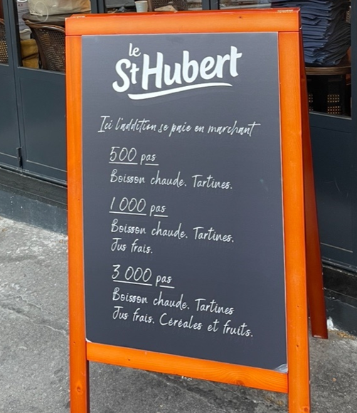 Il fallait parcourir 500 pas pour des tartines, 1000 pas pour rajouter du jus frais et 3000 pas pour la formule complète avec céréales et fruits.