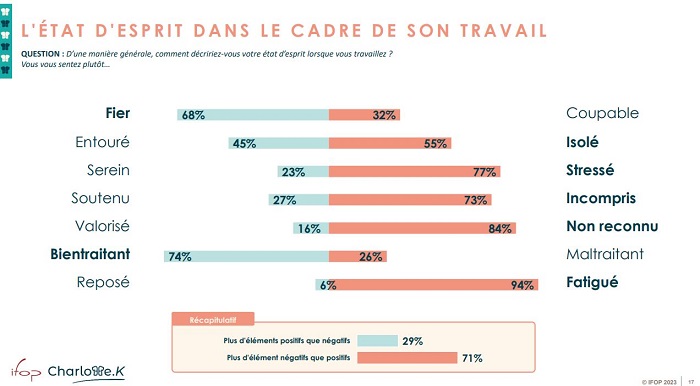 En souffrance au travail, ils se sentent en majorité isolés (55%), incompris (73%), stressés (77%), non reconnus (84%) et fatigués (94%, soit la quasi-unanimité d’entre eux).