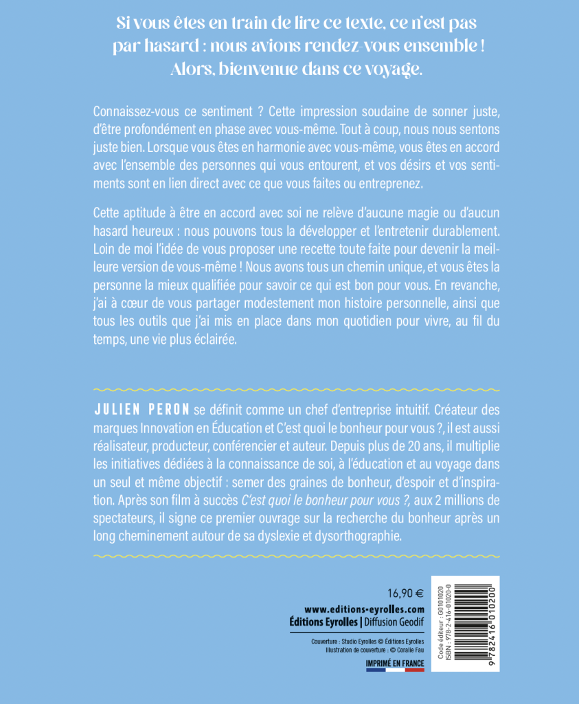 Après son film à succès C’est quoi le bonheur pour vous ?, aux 2 millions de spectateurs, JULIEN PERON signe ce premier ouvrage sur la recherche de bonheur après un long cheminement autour de sa dyslexie et dysorthographie.