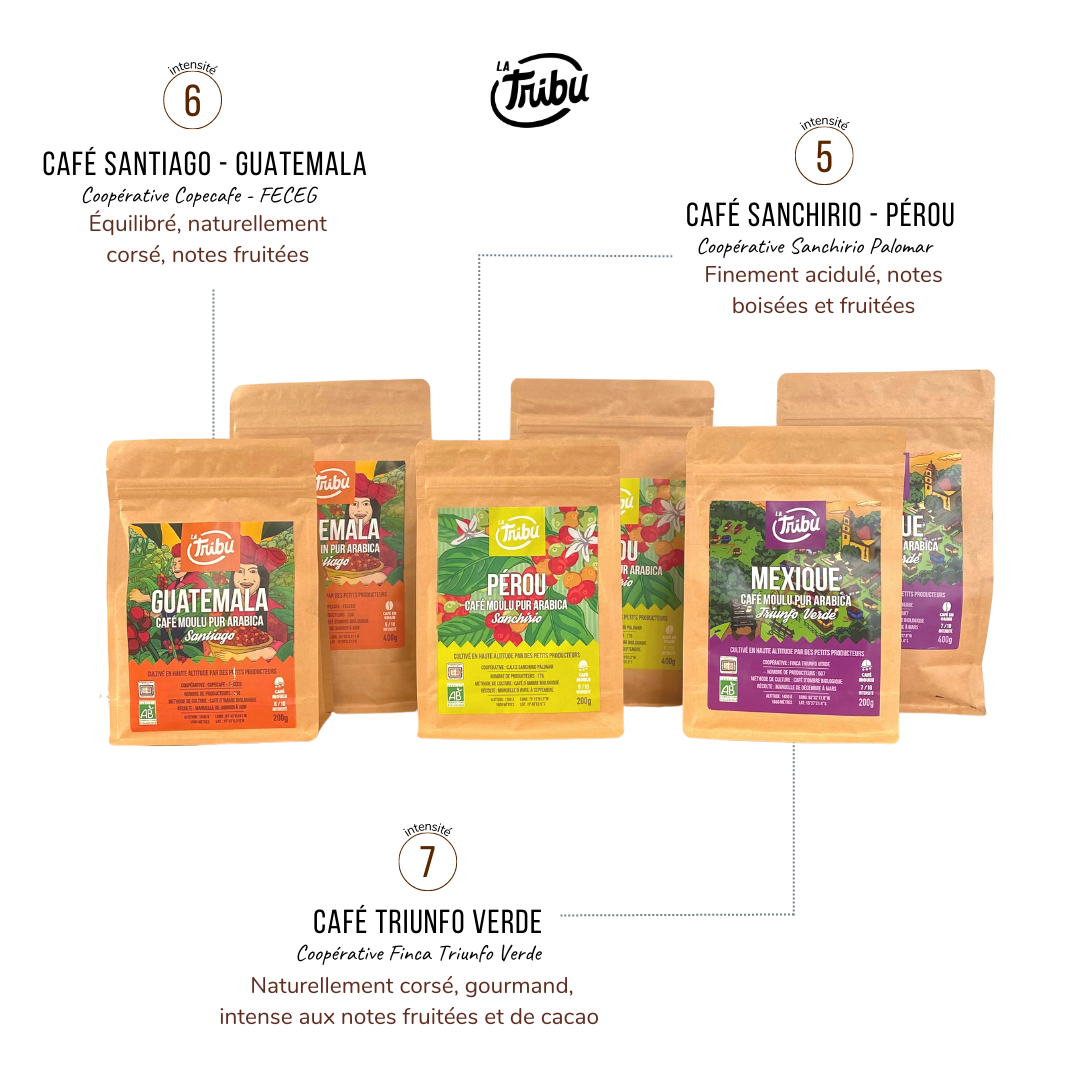 La Tribu propose une gamme de cafés issus de filières bio et équitables, cultivés en agroforesterie au Mexique, au Pérou et au Guatemala.