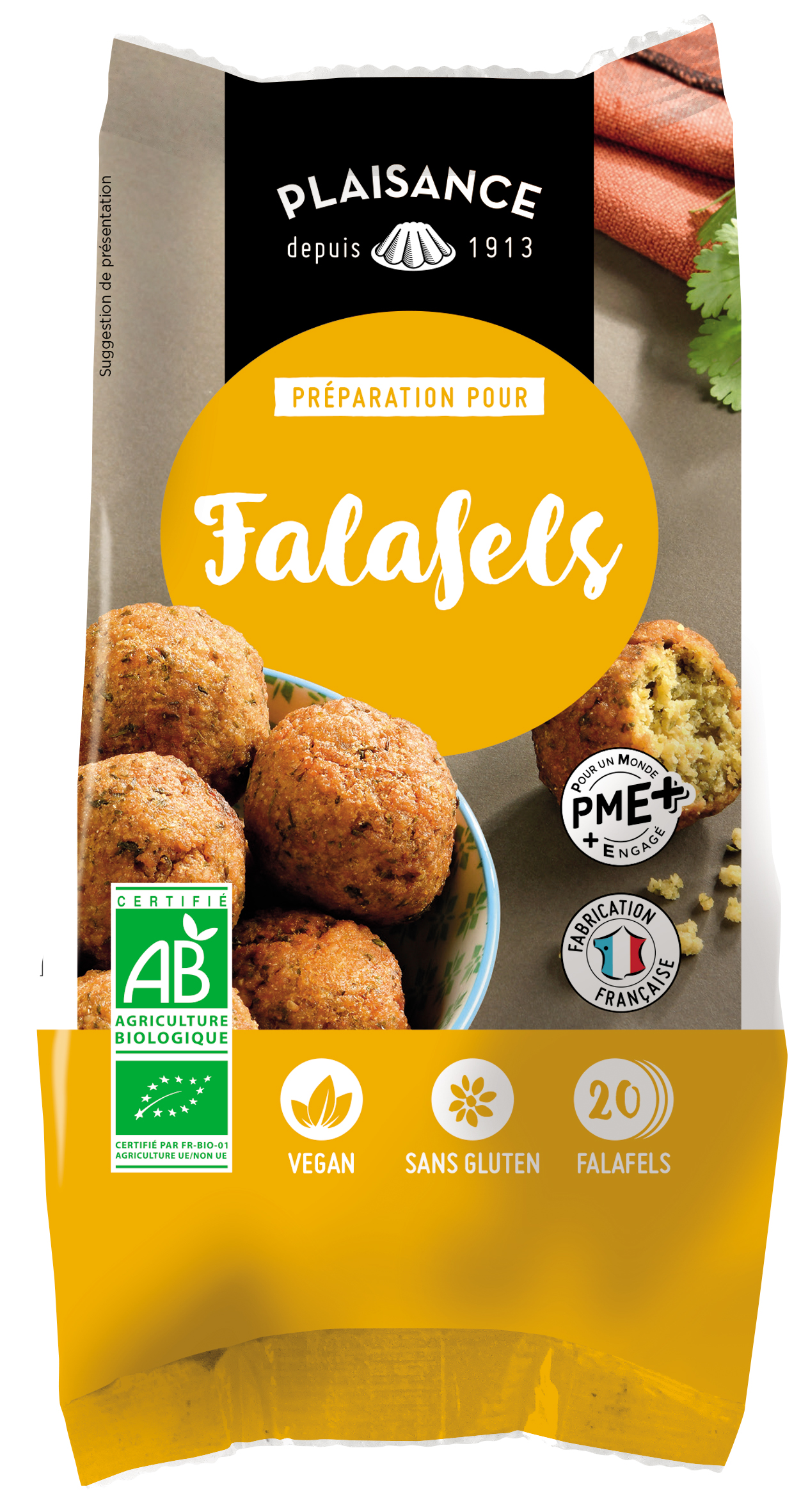 - Mix falafels sans gluten : couscous maïs-riz (farine de maïs, farine de riz blanche, eau), farine de pois chiches (30 %), brisure de pois chiches (5 %), cumin, oignon, coriandre, persil, sel de Guérande, ail, poivre noir.