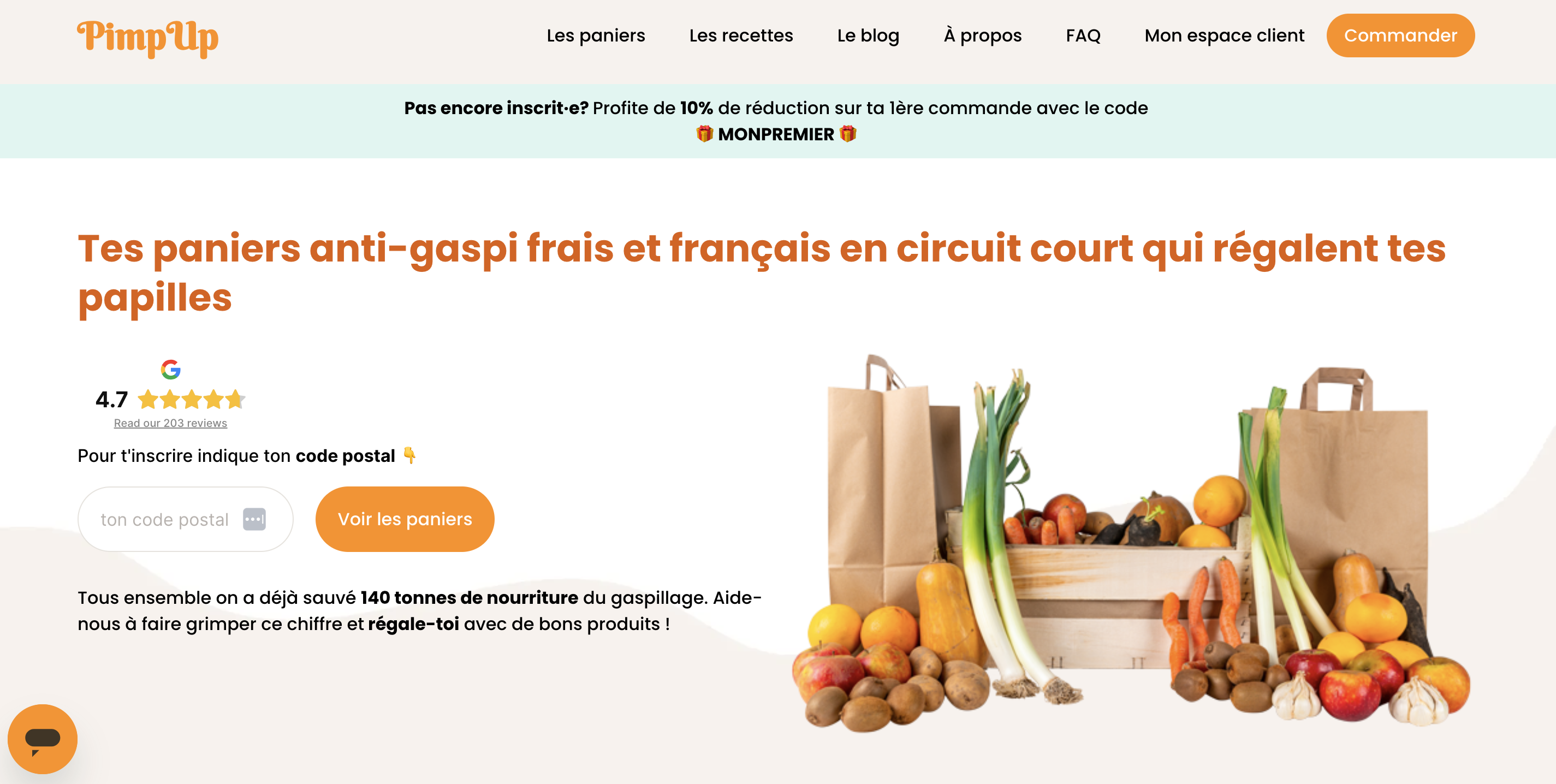 PimpUp fonctionne selon un modèle simple et efficace, permettant aux clients de profiter facilement de paniers anti-gaspillage remplis de fruits et légumes frais, français et de saison.