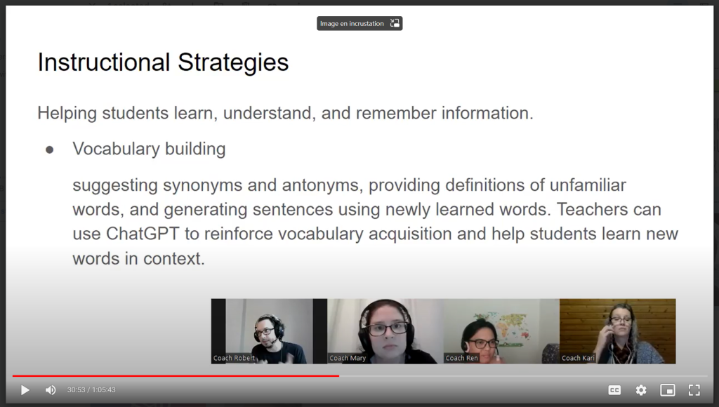 “Par exemple, j’ai une apprenante qui aime les chevaux, les dessins animés japonais et qui a besoin de pratiquer le passé composé. J’ai demandé à chatgpt de créer une histoire de 150 mots avec 5 questions à choix multiples et l’histoire devait l’inclure comme l’un des personnages. J’ai ensuite ajouté cette histoire aux diapositives que nous utilisons à chaque cours et je lui ai demandé de choisir des images appropriées pour illustrer l’histoire.
