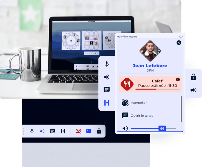 Holoffice est une application de télétravail qui offre des fonctionnalités complémentaires aux plateformes collaboratives. Elle a pour vocation de rompre l’isolement des collaborateurs en se focalisant sur les petits instants du quotidien, qui participent à la création d’un esprit d’équipe.