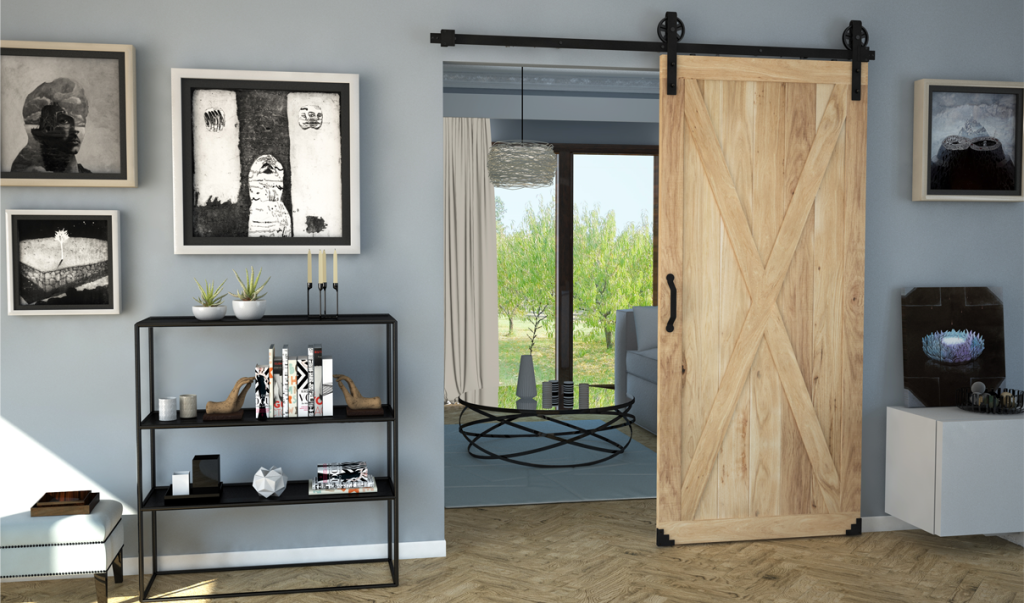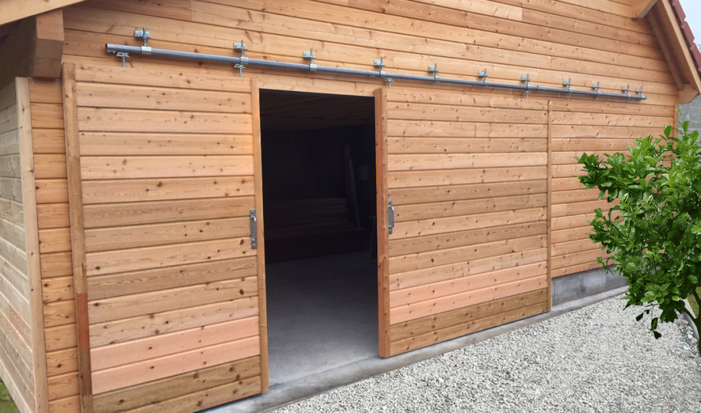 Pour porte d’extérieur : Les kits coulissants transforment ingénieusement l’entrée d’une véranda, une terrasse, une piscine, un garage, un abri de jardin, une grange, un atelier…