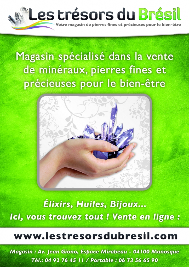 Minéraux, pierres polies, galets, objets de décoration, Elixirs de Cristaux, huiles de cristaux… Aux Trésors du Brésil vous pouvez être sûr de trouver tout ce dont vous avez besoin pour vous faire plaisir, pour offrir un cadeau spécialement eternel, pour pratiquer la lithothérapie, reiki, magnétisme etc.