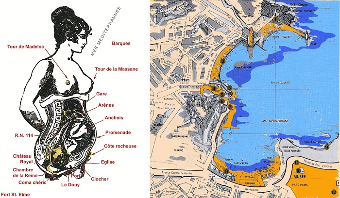 - Le cœur de la « Théorie » : explication des points de rapprochement opérés par l’artiste entre une coupe longitudinale féminine (d’après une étude de Léonard de Vinci) et une vue topographique du Port de Collioure.