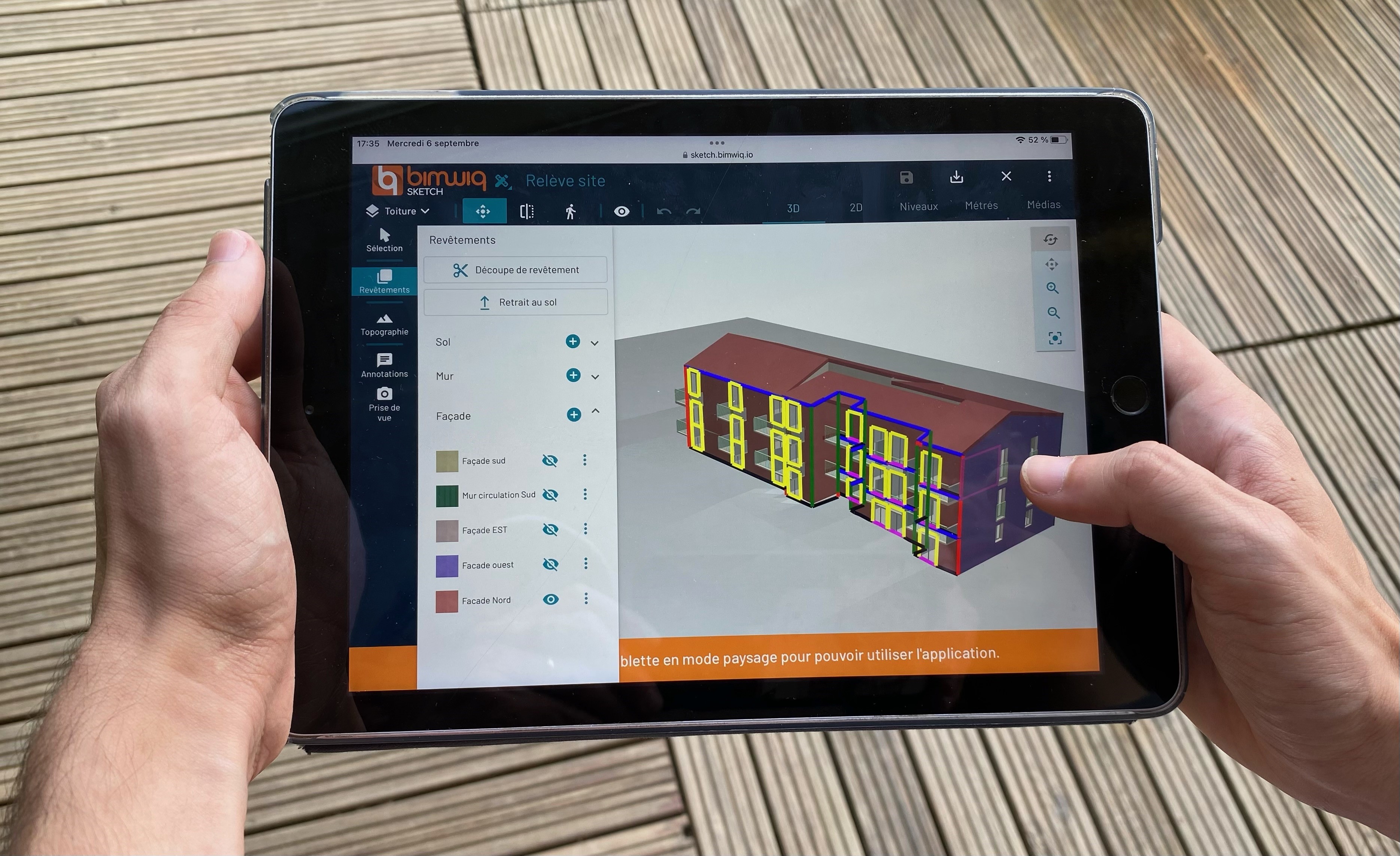 Bimwiq Sketch est l’une des premières applications qui permet de dessiner un bâtiment et de produire une maquette numérique BIM directement sur site.