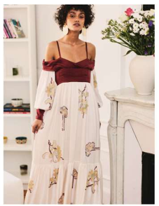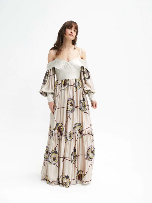 Cette robe longue d’une grande élégance est un hymne à la féminité grâce à sa taille cintrée et son bustier plissé aux épaules apparentes. Les manches ballon amples contrastent avec la taille cintrée et les dix petits boutons aux poignets apportent une touche rétro chic.