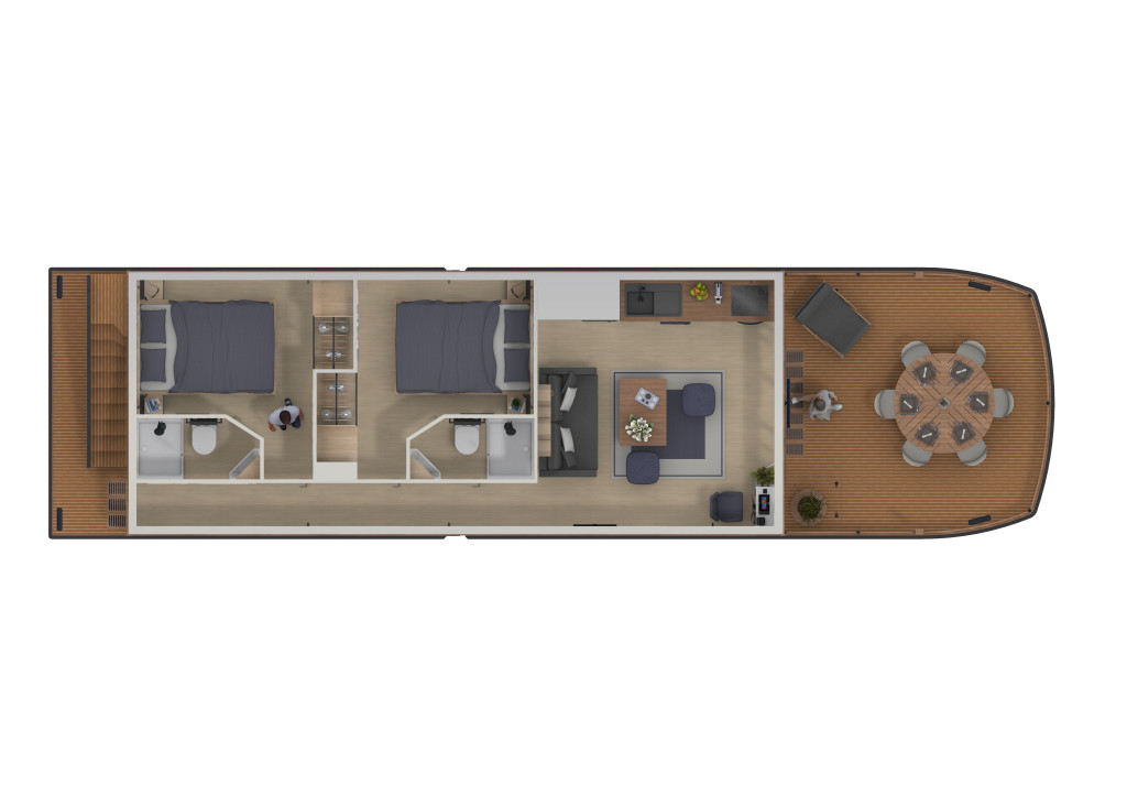 Destiné aux particuliers, le Houseboat est un écohabitat flottant qui peut également naviguer. Grâce à 25 m2 de panneaux solaires placés sur son toit, il offre une autonomie de sept heures de navigation fluviale en plus de la consommation domestique. Il peut également être utilisé en maritime côtier. Ultra équipé, il dispose d’un appartement de 50 m2 avec deux chambres, cuisine, salle de bain et cabinet de toilette, et de 30 m2 de terrasses extérieures.