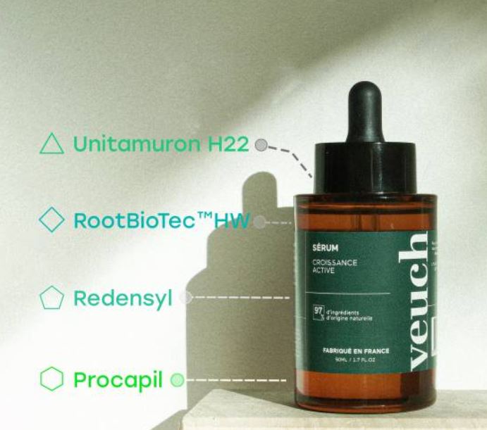 Le Sérum de Veuch contient 3 actifs permettant une meilleure irrigation des follicules pileux pour stimuler la repousse, un meilleur ancrage du bulbe capillaire pour renforcer le cheveu et un rajeunissement des cheveux existants.