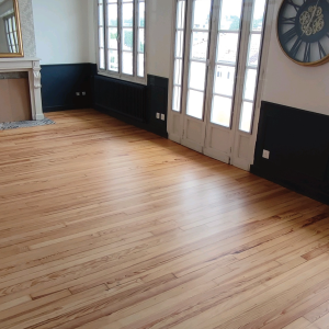 La seconde équipe est spécialisée dans la rénovation (ponçage et vitrification) des parquets anciens et la finition des parquets neufs posés bruts. « Il faut être pointilleux, parfaitement maîtriser les machines et les papiers de ponçage pour arriver à un superbe rendu à la fin » précise la gérante.