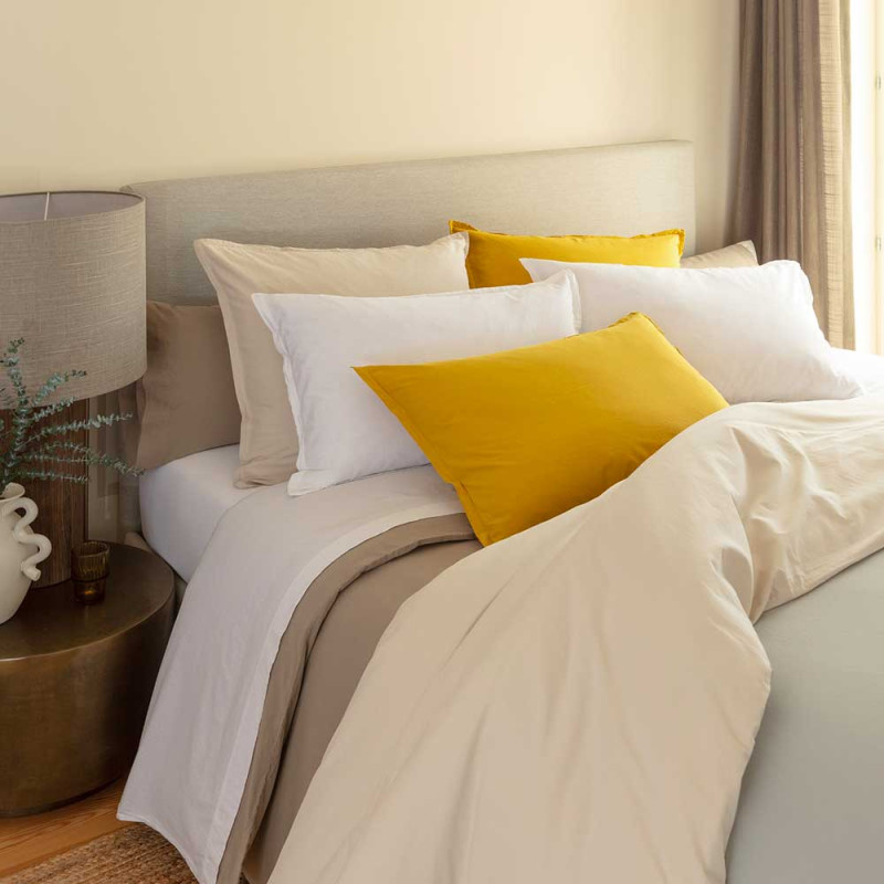 Cette parure de lit très douillette est composée d’une housse de couette, d’un drap-housse et de deux taies d’oreiller en coton lavé au toucher doux et légèrement froissé. Elle se décline en huit coloris que l’on peut combiner à souhait.