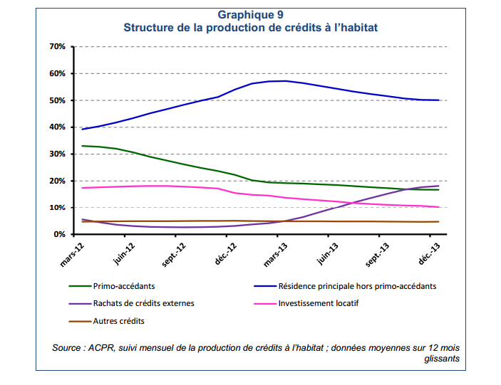 Selon le rapport de l’Autorité de Contrôle Prudentiel de la Banque de France (ACPR) de décembre 2013 sur les prêts à l’habitat, le rachat de crédit immobilier représente 18 % des prêts à l’habitat.